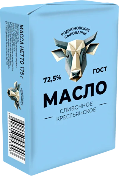 - Масло сливочное Крестьянское 72,5% «Родионовские сыроварни»;